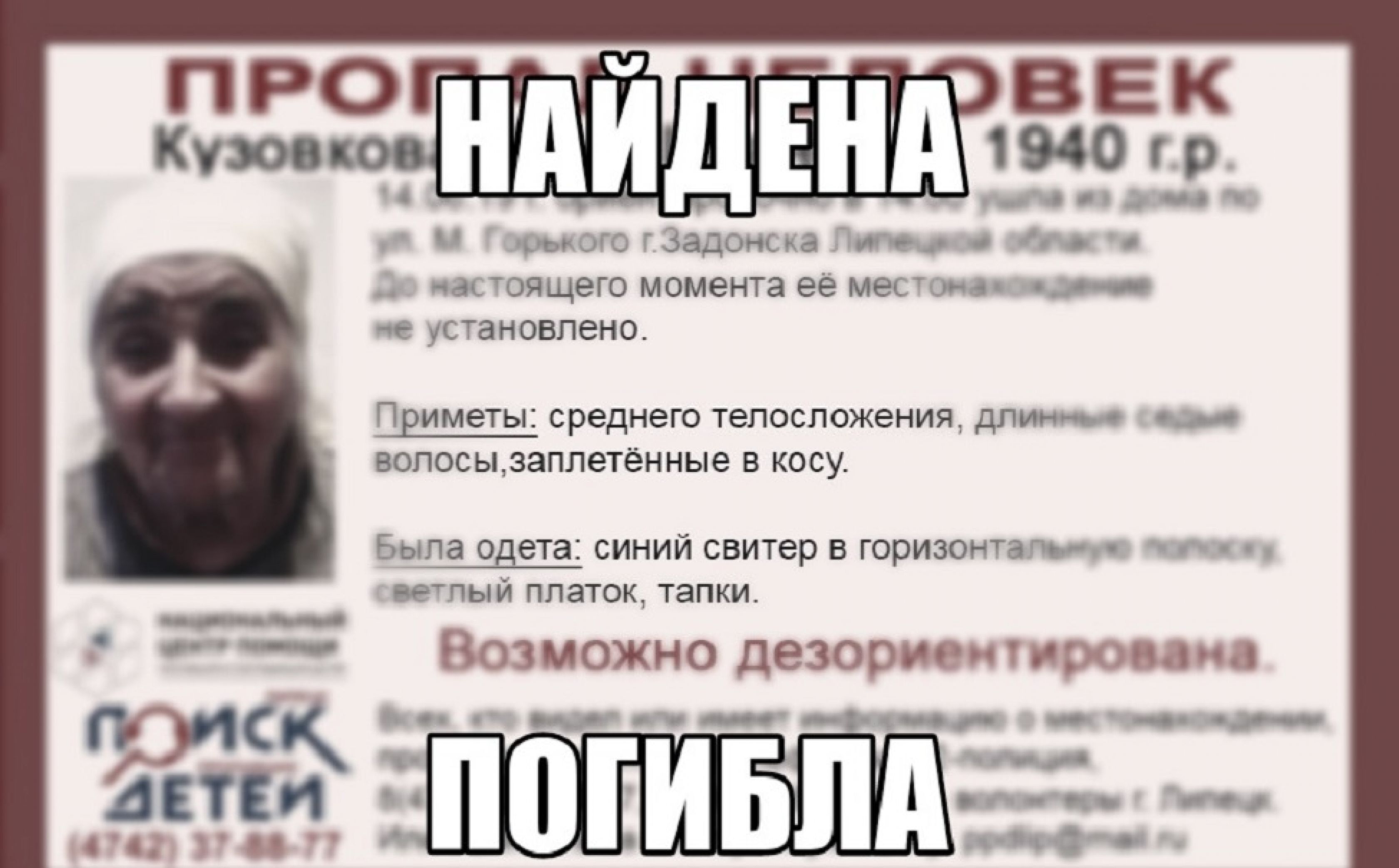 Пропавшая в Задонске пенсионерка найдена мёртвой