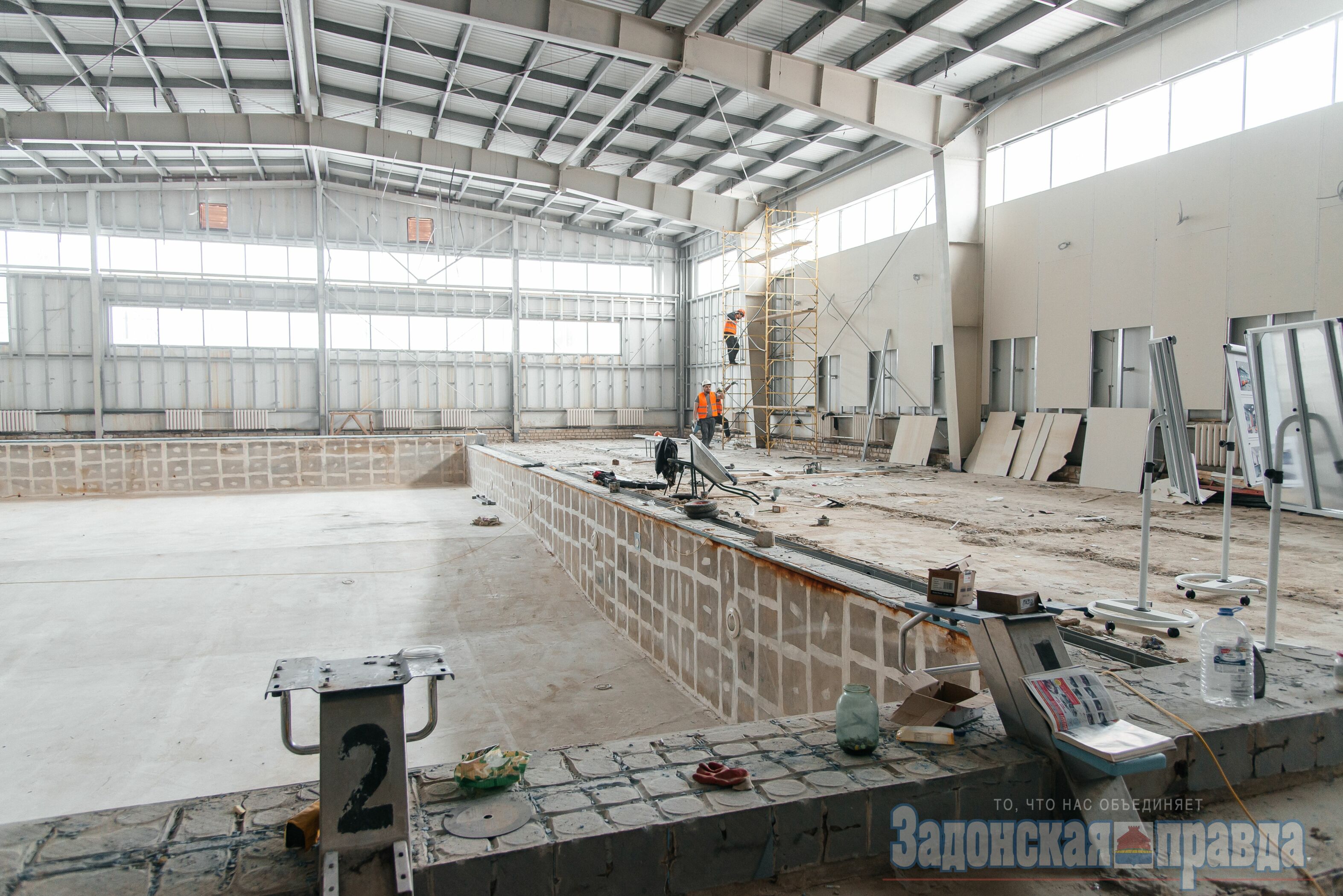 Комплексный ремонт охватывает всю территорию бассейна, включая спортивный зал, чашу бассейна, внутренние и внешние пространства. На данный момент выполнено уже 40% работ: демонтированы старые двери, штукатурка, мягкая кровля, подшивка потолков и покрытие полов. Также активно идут электромонтажные работы и шпаклевка стен. В ремонте задействованы 21 рабочий и несколько единиц техники, общая стоимость работ составляет 77 млн рублей.
